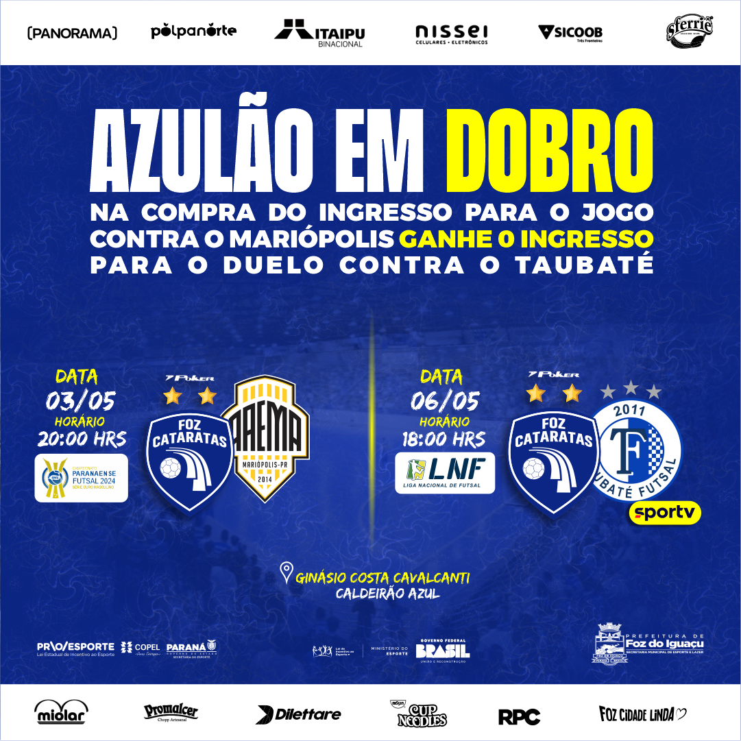 O Azulão das 3 Fronteiras enfrenta o Mariópolis na sexta-feira, 3, às 20 horas, pelo Paranaense. Na segunda-feira, 6, às 18 horas, o duelo será contra o Taubaté, pela 6ª rodada da Liga Nacional de Futsal. Os dois confrontos serão no Caldeirão Azul, em Foz do Iguaçu. O duelo com o Taubaté será transmitido pelo SporTV.